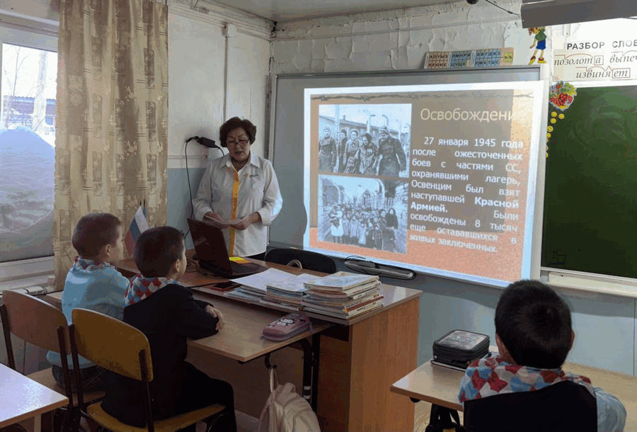 В этот день советник директора по воспитанию и взаимодействию детских общественных объединений провела классный час на тему: «День памяти Холокоста». Анна Ивановна показала фото того времени и рассказала о жестоких преступлениях фашистов по уничтожению евреев